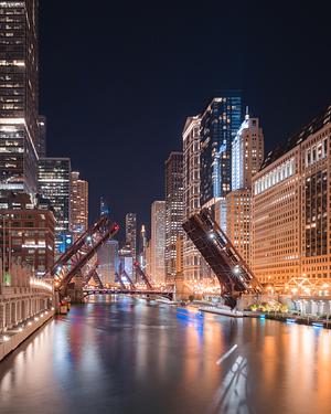 Chicago River Bridges Up At Night From Merch Mart